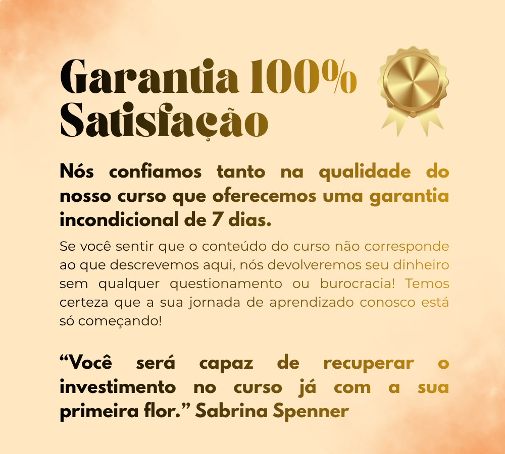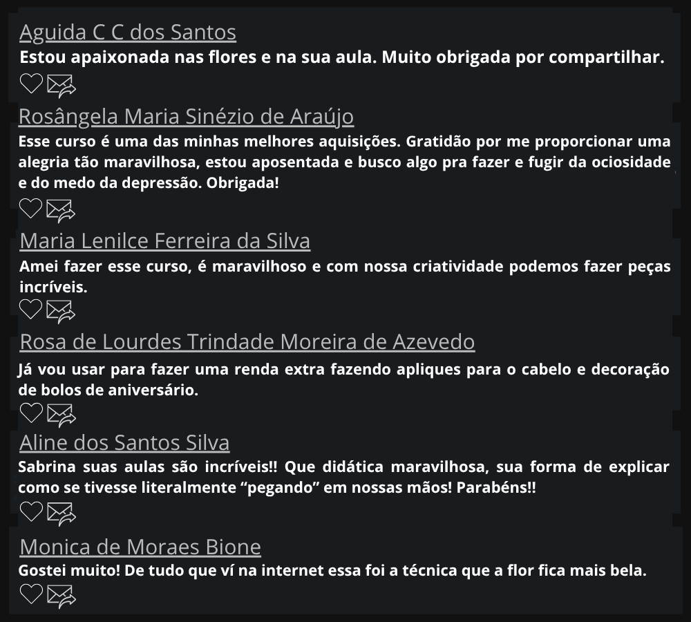 Ao se inscrever, você automaticamente já faz parte da nossa Comunidade Apaixonada por Flores. Toda a interação é feita dentro da Plataforma Hotmart. Você poderá tirar dúvidas e compartilhar suas criações.
