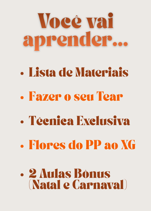 Logo na primeira aula, você poderá baixar um E-book de Apresentação com a Lista de Materiais e Ferramentas que irá precisar para fazer cada peça. Além disso, você terá uma aula para aprender a fazer o seu próprio Tear, que vai deixar a sua produção muito mais fácil e rápida.